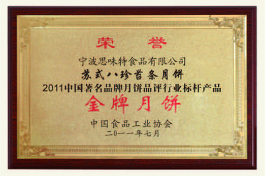 4. 中國(guó)食品工業(yè)協(xié)會(huì)授予荃盛《蘇式八珍苔條月餅》“金牌月餅”;